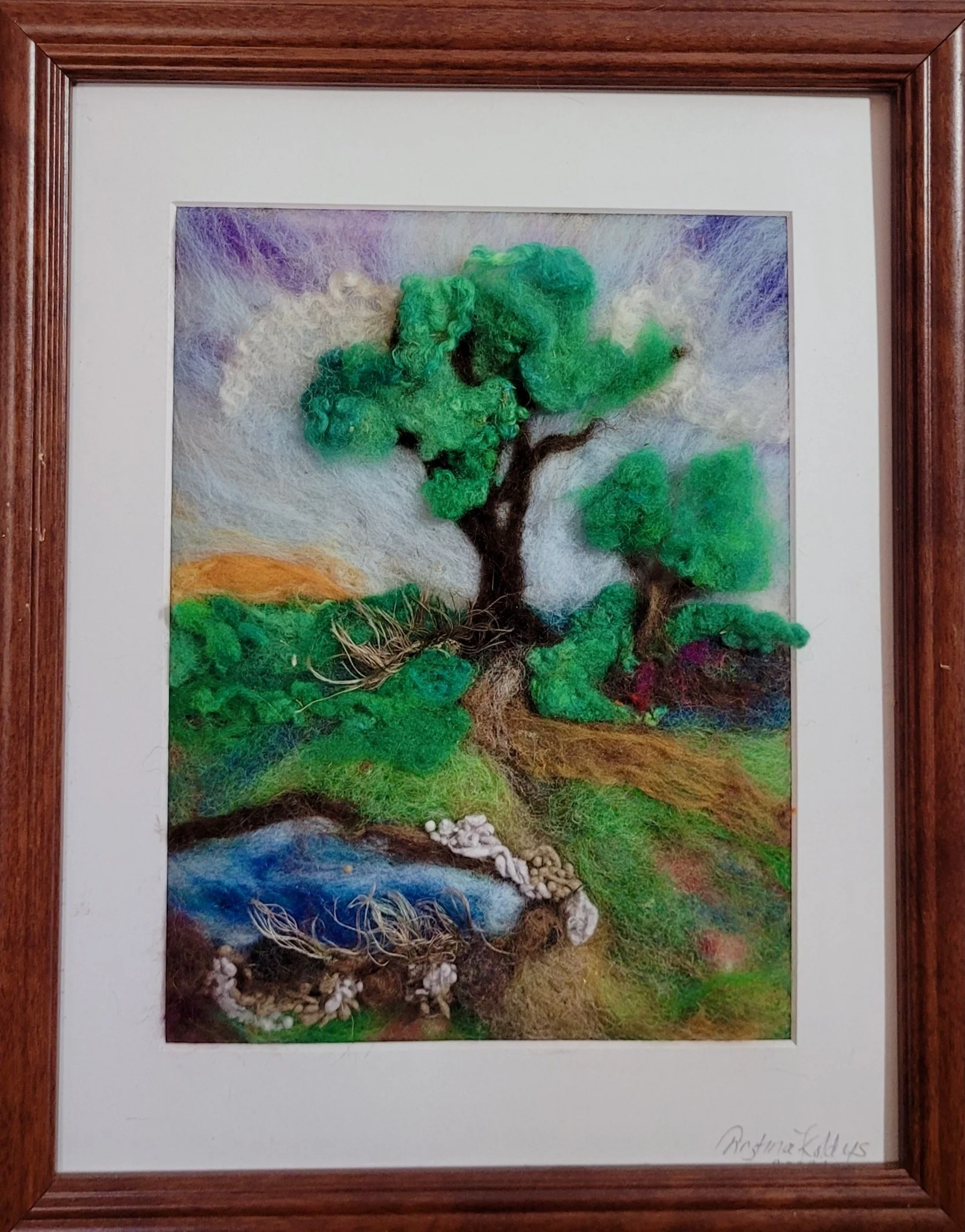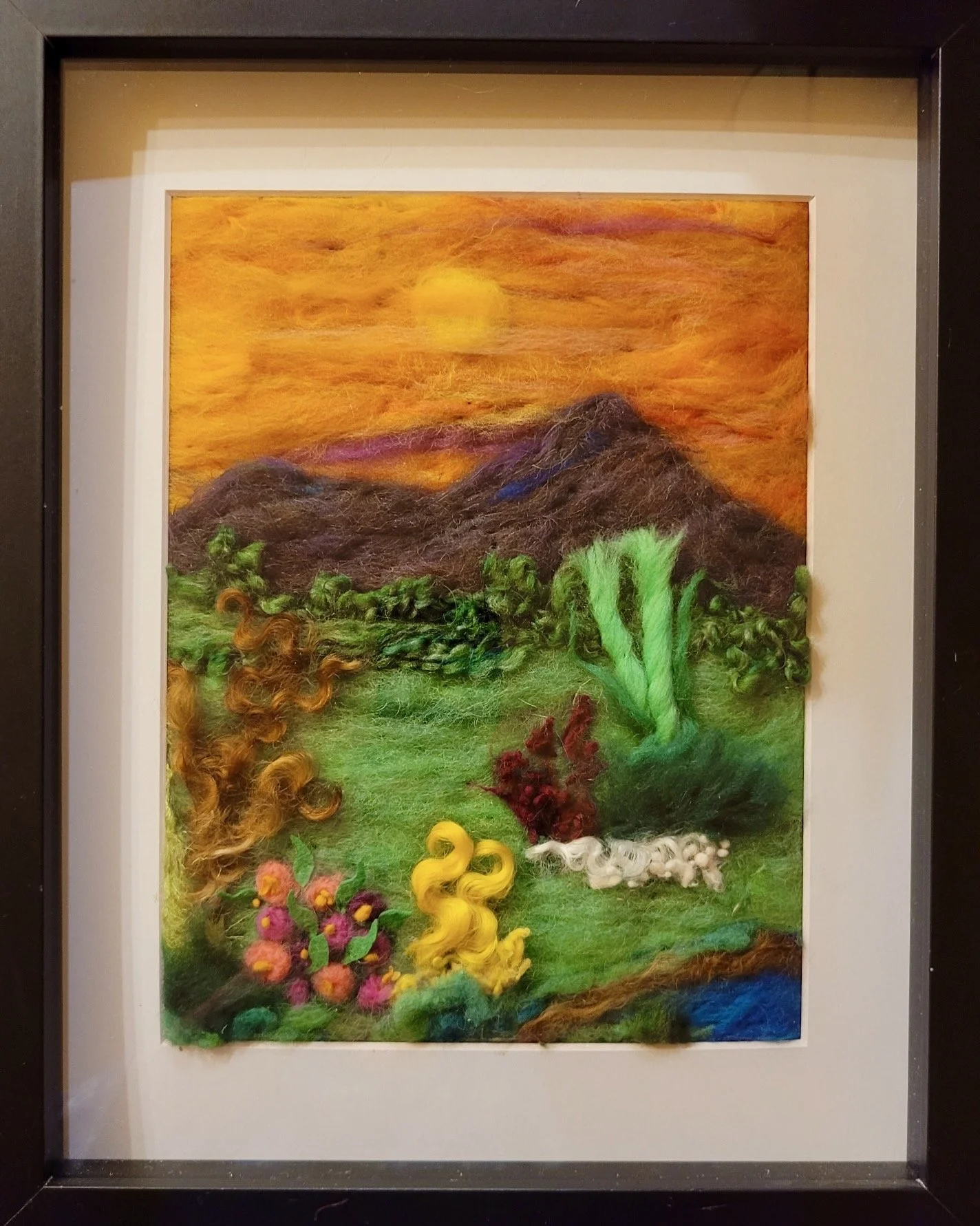 These paintings made with wool, are needlefelted using a single needle. Ive never counted but it must be a least 1,000 pokes! Materials such as wool nepps, sari silk and other natural fibers brings depth and texture to each piece.